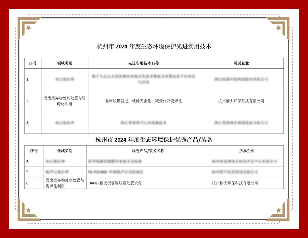 近日,杭州市环保产业协会正式发布了2024年度副省级城市“生态环境保护先进实用技术”及“生态环境保护优秀产品/装备”的评审结果,楠大环保易腐垃圾处置技术及设备分别入选!